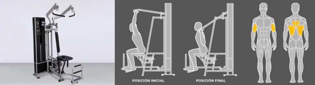 És un exercici excel·lent per a desenvolupar trapezi inferior, múscul dorsal major i múscul bíceps braquial. És molt útil per a combatre molèsties i desequilibris musculars associats a la zona dorsal de l’esquena. Durant l’exercici no s’exerceix compressió sobre la columna i el seu efecte de tracció, al final del moviment, és molt adequat per a persones amb dolor dorsal i lumbar. Vigilarem també en aquest cas els últims graus de flexió d’espatlla en aquelles persones que sofreixin molèsties en la zona. És important en realitzar l’exercici que els colzes en descendir vagin a buscar el lateral del cos, evitant portar-los cap endavant o massa cap endarrere.