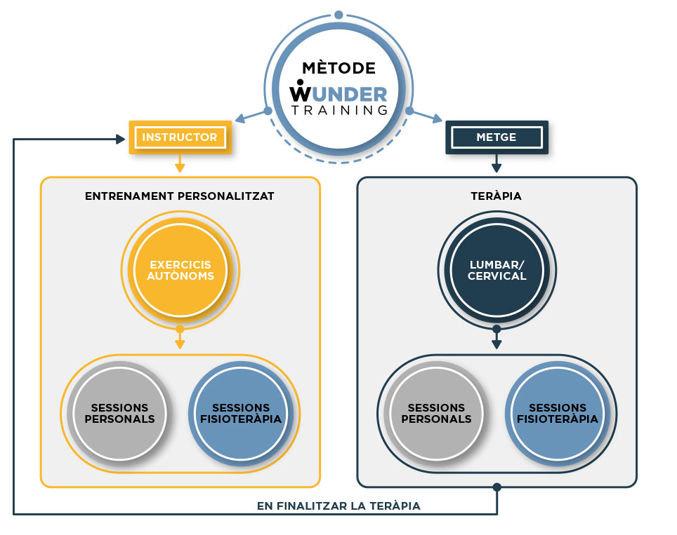 Com pots veure al gràfic de sota, en ambdues àrees hi ha la possibilitat de complementar el tractament amb sessions de fisioteràpia o entrenament personal en funció de les necessitats i amb la freqüència que necessiti cada persona. En aquest gràfic també pots observar que l’objectiu és que una persona que comença amb un dolor d’esquena important, millori el seu dolor mitjançant la teràpia mèdica i després pugui passar a l’àrea d’entrenament personalitzat, per seguir mantenint els resultats, prevenir nous episodis i aconseguir una millora més global de la seva condició física.