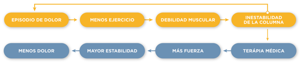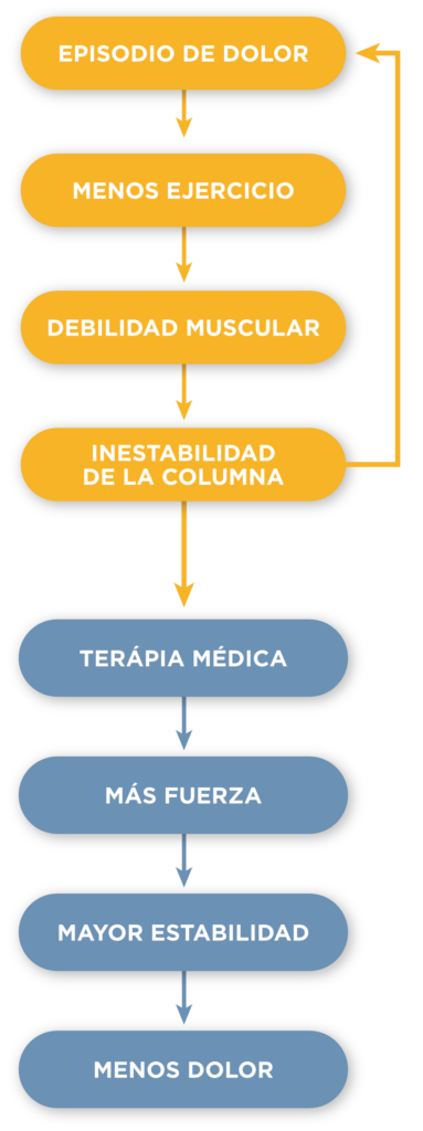 El dolor inicia con frecuencia un proceso de desacondicionamiento físico: disminuye la actividad, aparece la debilidad muscular y aumenta la inestabilidad, especialmente a nivel de la columna. Este círculo vicioso no solo mantiene el dolor, sino que puede intensificarlo con el tiempo.