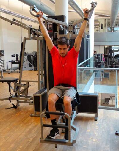 Fortalecimiento de trapecio inferior, dorsal ancho y bíceps. Muy útil para combatir molestias y desequilibrios musculares asociados a la zona dorsal de la espalda y ganar fuerza en los brazos para el uso de muletas.