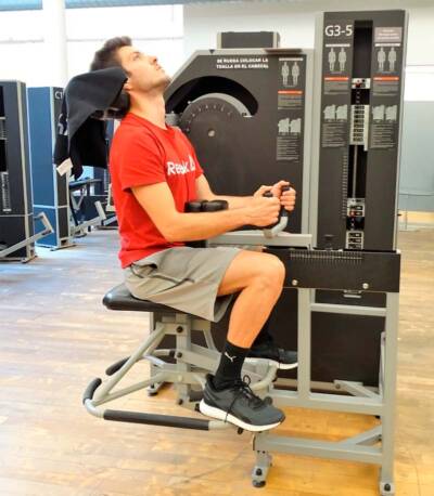Fortalecimiento especifico de los extensores cervicales para combatir las molestias en la región cervical, muy típicas en esta fase de la recuperación por el uso de muletas al caminar.
