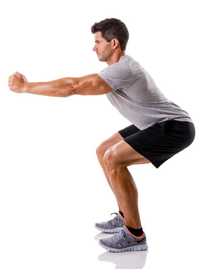 Con este ejercicio se fortalecen los músculos de la cadera, cuádriceps y glúteos. Para realizarlo, sitúate de pie, con las piernas separadas a la altura de los hombros o un poco más, y flexiona las rodillas como si fueras a sentarte mientras estiras los brazos hacia delante para mantener el equilibrio. Las rodillas no deben sobrepasar nunca los dedos de los pies y los muslos deberían quedar en un ángulo de 90° con las pantorrillas. Mantén la espalda recta y erguida.