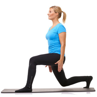 Un ejercicio que además de reforzar las rodillas nos ayuda a tonificar muslos y glúteos. De pie y con los pies juntos, desplaza una pierna hacia atrás y baja el cuerpo flexionando las rodillas, de manera que ambas piernas formen un ángulo de 90°. Mantén la espalda recta y erguida.