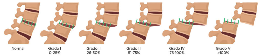 Como decíamos en la introducción son dos patologías que suelen afectar a la columna lumbar y sacra. La zona más frecuentemente afectada es a nivel de las vértebras L4-L5, las más bajas de la columna lumbar. La espondilolistesis es el desplazamiento de una vértebra sobre otra y su gravedad se clasifica en 5 niveles según la distancia de desplazamiento. El desplazamiento anterior conocido como anterolistesis es más frecuente que el desplazamiento posterior o retrolistesis.