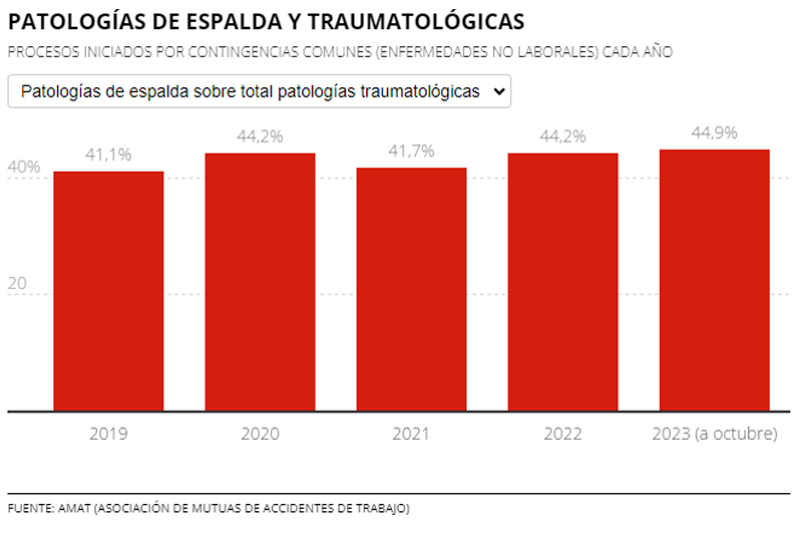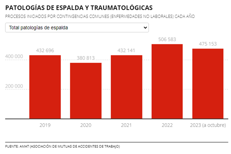El artículo continúa señalando que los datos de la Asociación de Mutuas de Accidentes de Trabajo cifran en un 87% las bajas que están relacionadas con patologías traumatológicas, como lesiones en rodillas y otras articulaciones, así como afectaciones en la espalda. Los datos de las mutuas indican, además, que tantos las lumbalgias como otras dolencias en la columna cuya causa no son las enfermedades laborales, sino la vida fuera el trabajo, también han ido a más (431.696 incapacidades temporales en 2019 frente a 506.583 en 2022).