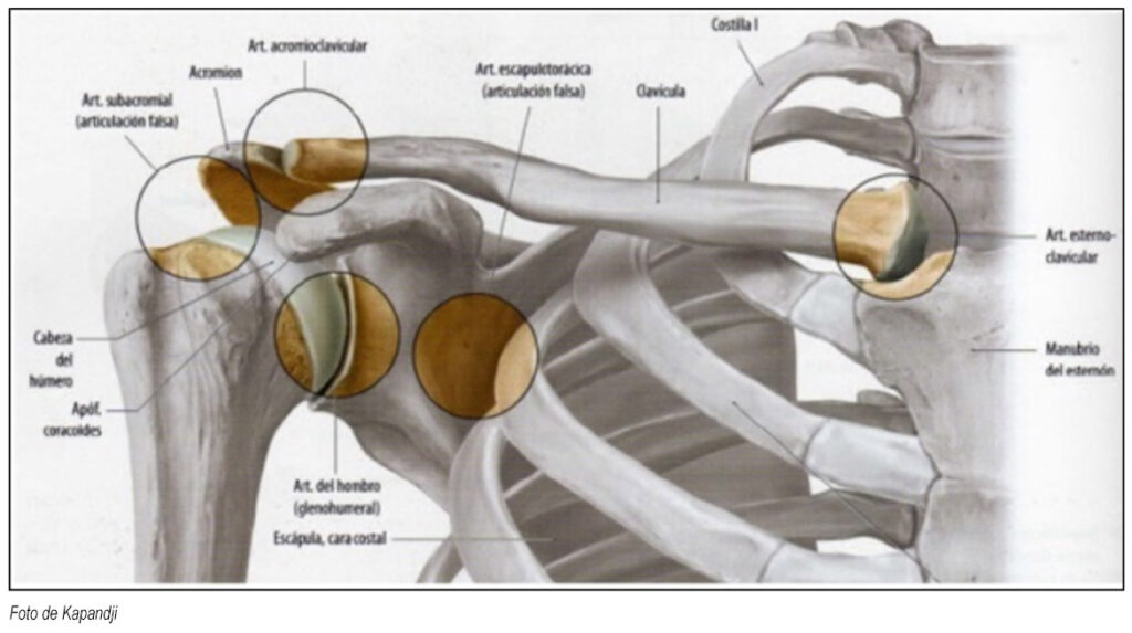 La articulación del hombro es compleja puesto que está formada por varias articulaciones. Todas ellas trabajan conjuntamente para permitir un movimiento armónico global. Si alguna falla, el movimiento del hombro se verá afectado. Las articulaciones que componen el hombro se dividen en dos grupos básicos. El primer grupo lo forman la articulación glenohumeral (cabeza del humero y cavidad glenoidea) y la articulación subdeltoidea (cara profunda del deltoides y manguito de los rotadores). El segundo grupo está formado por la articulación escapulo torácica (escapula y parrilla costal), la articulación acromioclavicular (acromion y parte externa de la clavícula) y articulación esternoclavicular (esternón y parte interna de la clavícula).
