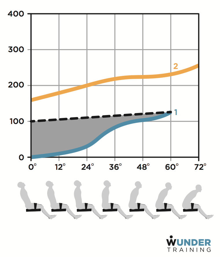 Esta imagen muestra dos curvas de fuerza diferentes de un paciente: una antes de la terapia con la máquina lumbar y la otra, después. El eje vertical representa la fuerza, y el horizontal, la amplitud de movimiento. La flexión se realiza a 72° y la extensión, a 0°. La Curva de fuerza 1 muestra el estado del paciente antes de la terapia y la Curva 2, después de la terapia. En cada caso, la curva de fuerza representa la capacidad funcional de los músculos extensores aislados de la espalda y podemos deducir tres cosas: la movilidad de la columna lumbar, el nivel de fuerza y los desequilibrios musculares. En otras palabras, esto proporciona una imagen objetiva del estado de los extensores lumbares antes, durante y después de la terapia de fortalecimiento muscular.