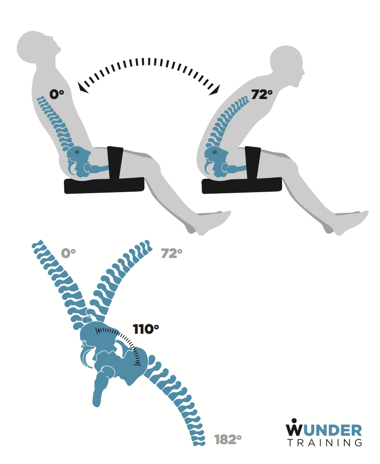 Si la columna lumbar no se aísla, la flexo-extensión del tronco es de 182°. Este movimiento está compuesto por la extensión de la cadera (110°) y la extensión lumbar (72°), y vemos que los glúteos y los músculos de las piernas realizan la mayor parte del esfuerzo.