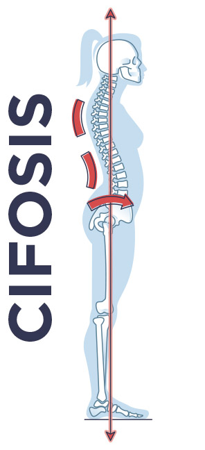 Es el aumento de la curva de la columna dorsal que produce un arqueamiento de la espalda dando lugar a una postura jorobada. Suele acompañarse de unos hombros y cabeza desplazados hacia delante.