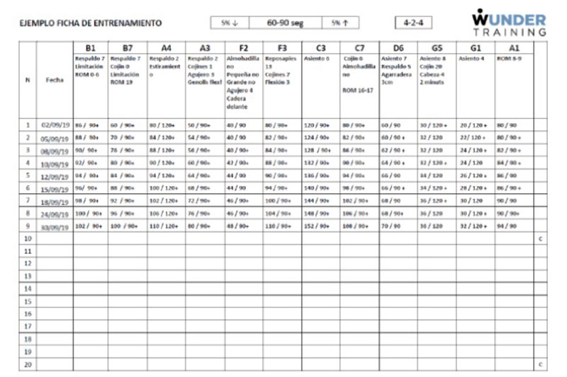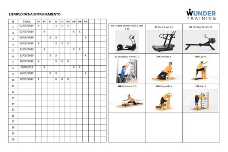 La ficha de entrenamiento, que aprenderás a utilizar tras las 3 primeras sesiones, te permitirá medir las diferentes variables que afectan al entrenamiento como son los ajustes de los ejercicios, la intensidad del entrenamiento, la duración del ejercicio o el peso utilizado, entre otras. Así podrás medir tu evolución y permitirá a los entrenadores adaptar los ejercicios a tus nuevas condiciones y necesidades.