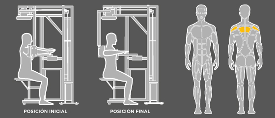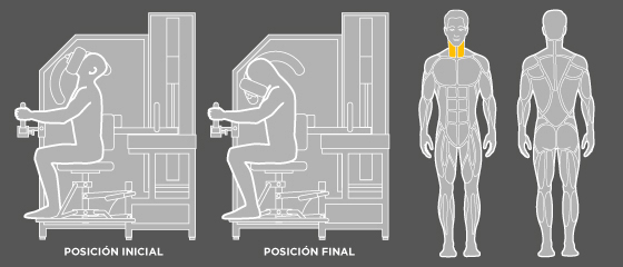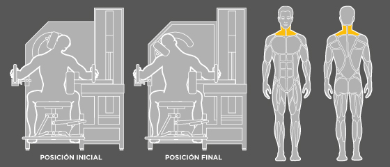 Máquina para el tratamiento del dolor cervical. Asegura una completa inmovilización de los hombros y del tronco para reforzar de forma aislada la musculatura extensora cervical.