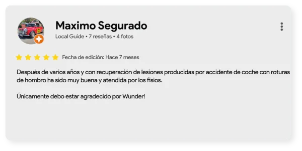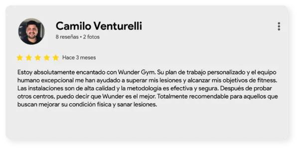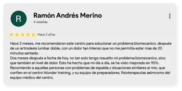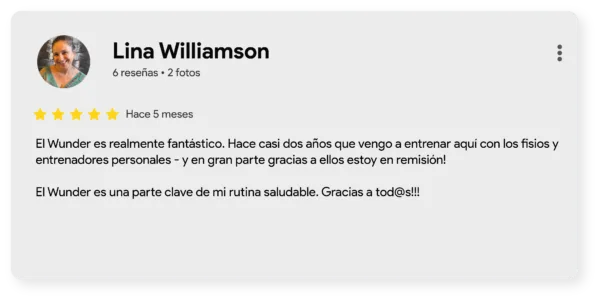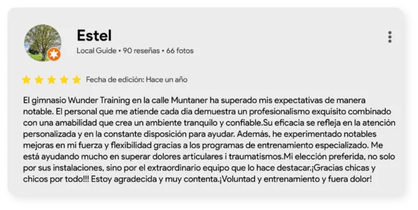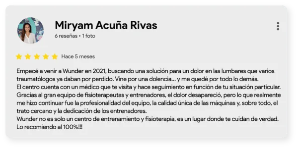 En este artículo queremos mostrar, a través de sus palabras, cómo el método Wunder Training une ciencia, acompañamiento y resultados reales. Recorreremos las cuatro áreas que forman nuestro enfoque integral —Entrenamiento, Terapia Médica para el dolor de espalda, Fisioterapia y Entrenamiento Personal— para descubrir qué opinan quienes ya han vivido esta experiencia y cómo cada servicio se complementa para mejorar la salud, la fuerza y la calidad de vida. No se trata solo de entrenar más, sino de entrenar mejor.