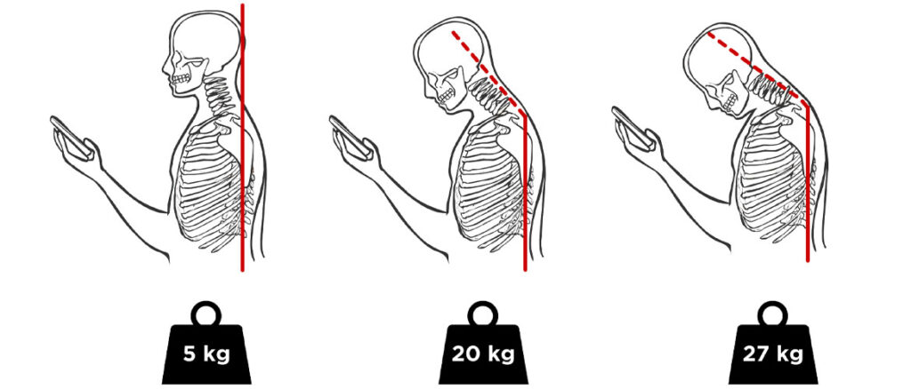El peso de nuestra cabeza es de aproximadamente 5kg en personas adultas. Si nuestro cuello trabaja en una posición erguida esto no es un problema, pero, la flexión del cuello que realizamos al visualizar nuestras pantallas, hace que la carga que han de soportar los músculos, ligamentos y tendones del cuello y de los hombros sea mucho mayor. Flexionar la cabeza 45º supone soportar una carga de más 20 kg en nuestra columna cervical. Con 60º de flexión el impacto sobre nuestro cuello es de 27kg.