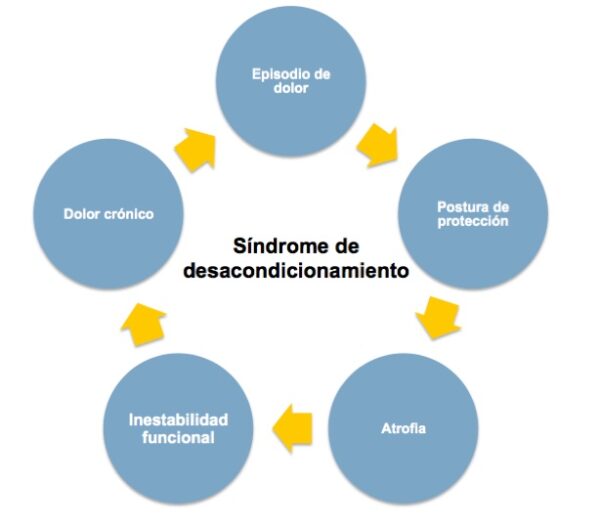 Cuando se produce un episodio de dolor de espalda las personas reaccionan con una acción refleja de autoprotección, que consiste en mover menos la espalda. Esa falta de movimiento implica a largo plazo que la columna vertebral no sea sometida a una carga adecuada y en consecuencia los músculos autóctonos de la espalda se atrofian. Con la atrofia somos más propensos a desencadenar otro episodio doloroso, agravando la disminución de movimientos de la espalda y provocando más atrofia muscular. Este proceso se conoce como el síndrome de desacondicionamiento físico (MAYER y GATCHEL, 1988 y FRYMOYER, 1991 y otros).